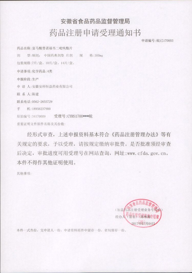 2017年7月4日,安徽安科恒益藥業有限公司新藥品種——富馬酸替諾福韋二吡呋酯及富馬酸替諾福韋二吡呋酯片申請生產注冊,已取得藥品注冊申請受理通知書。