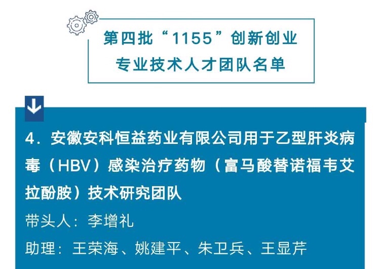 為深入推進實施新時代銅都英才計劃,經單位推薦、部門審核、專家評審,市人才工作領導小組會議審定等程序,我公司的一項用于乙型肝炎病毒(HBV)感染治療藥物(富馬酸替諾福韋艾拉酚胺)技術研究團隊入選銅陵市第四批“1155”創新創業專業技術人才團隊。此次入選團隊共10個,也是安科恒益藥業公司第二次入選。