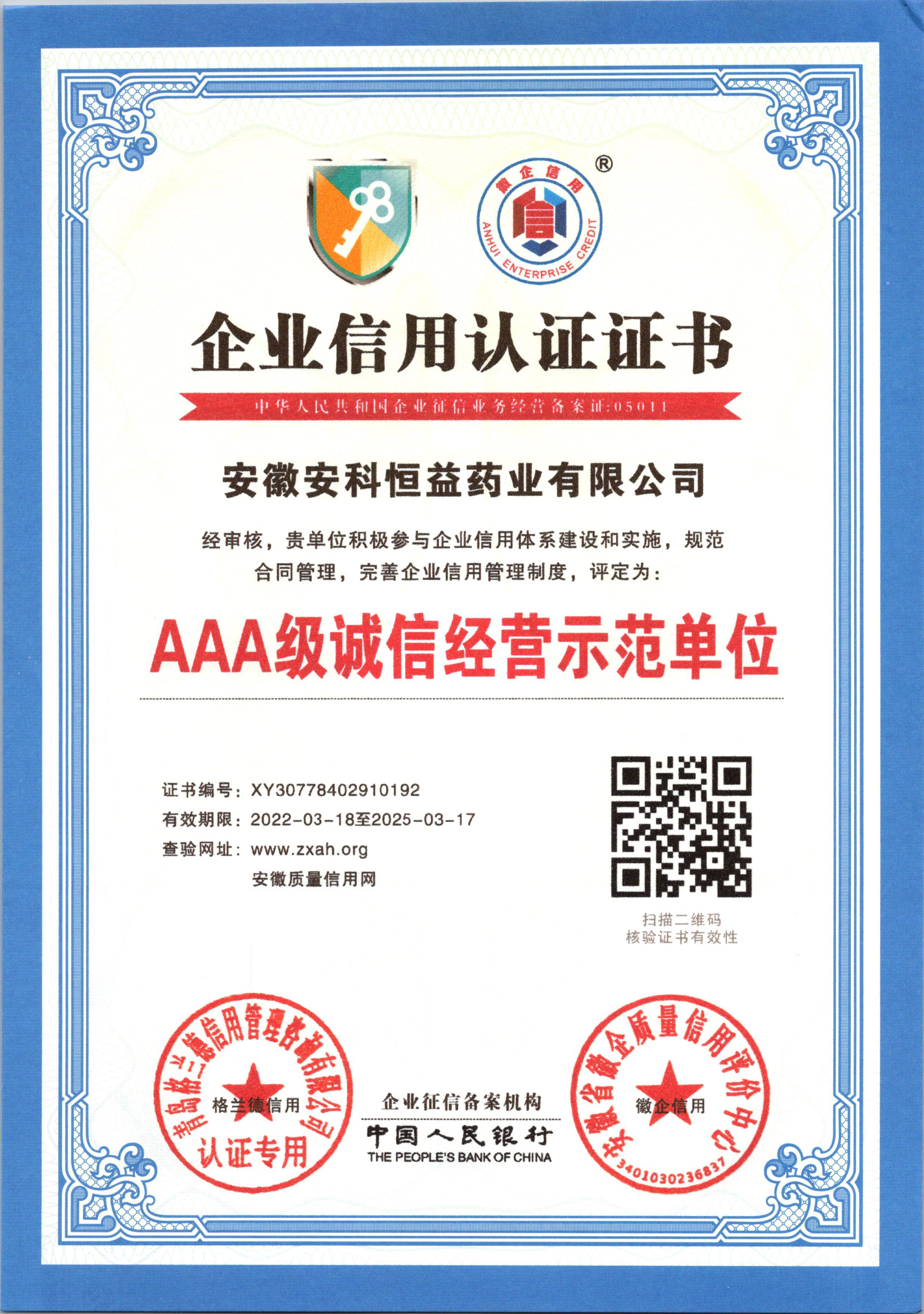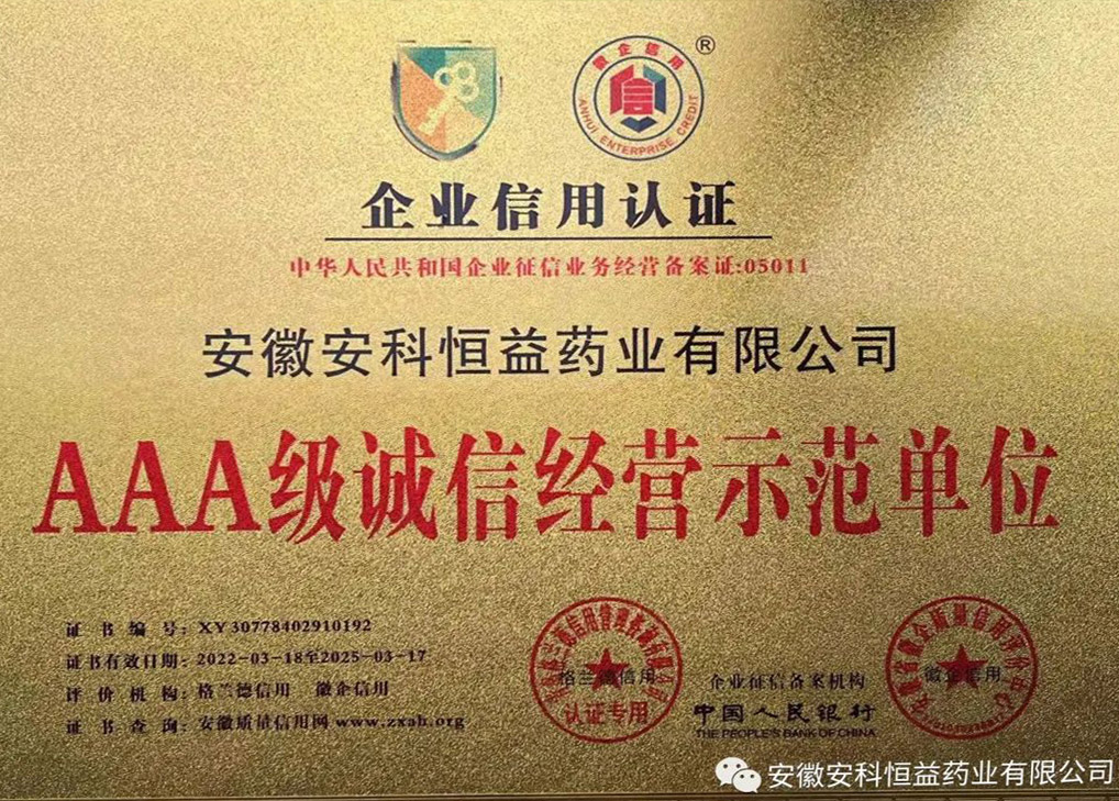 經安徽省徽企信用評價有限公司、安徽省徽企質量信用評價中心評審,綜合公司市場活動、經營狀況、信用管理等方面記錄,評定企業信用等級為“AAA級誠信經營示范單位”,并頒發了獎牌及證書。